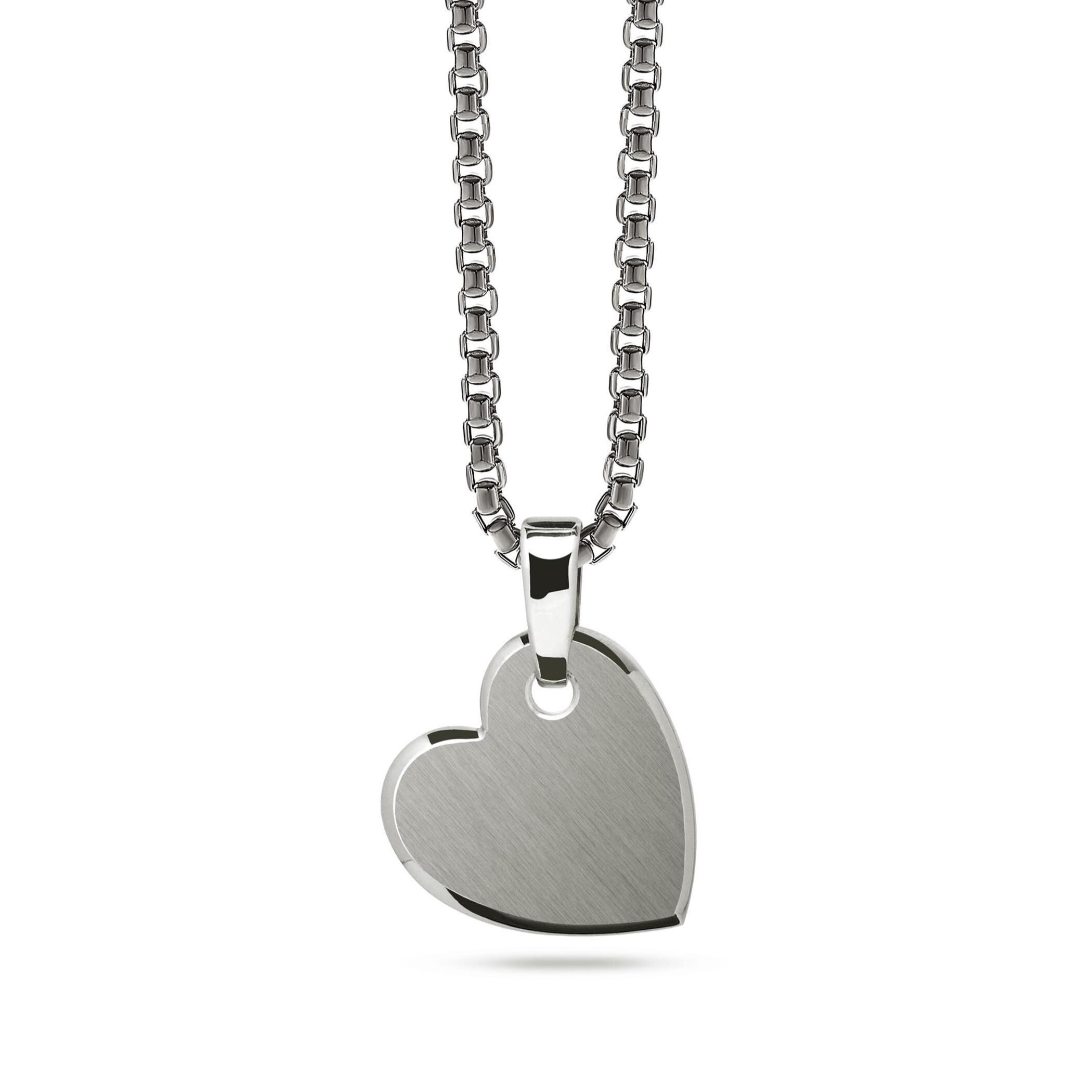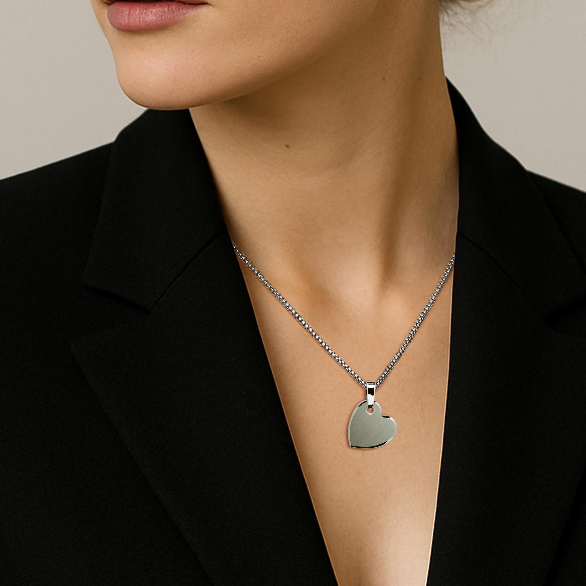This Heart Tag Pendant offers a modern, minimalist take on a classic symbol of affection. Sculpted from high-quality 316L Stainless Steel, the piece stands out with its sophisticated Two-Tone finish, The main front surface is finely brushed for a contemporary, matte look, The perimeter and edges are highly polished to create a brilliant, defined frame.