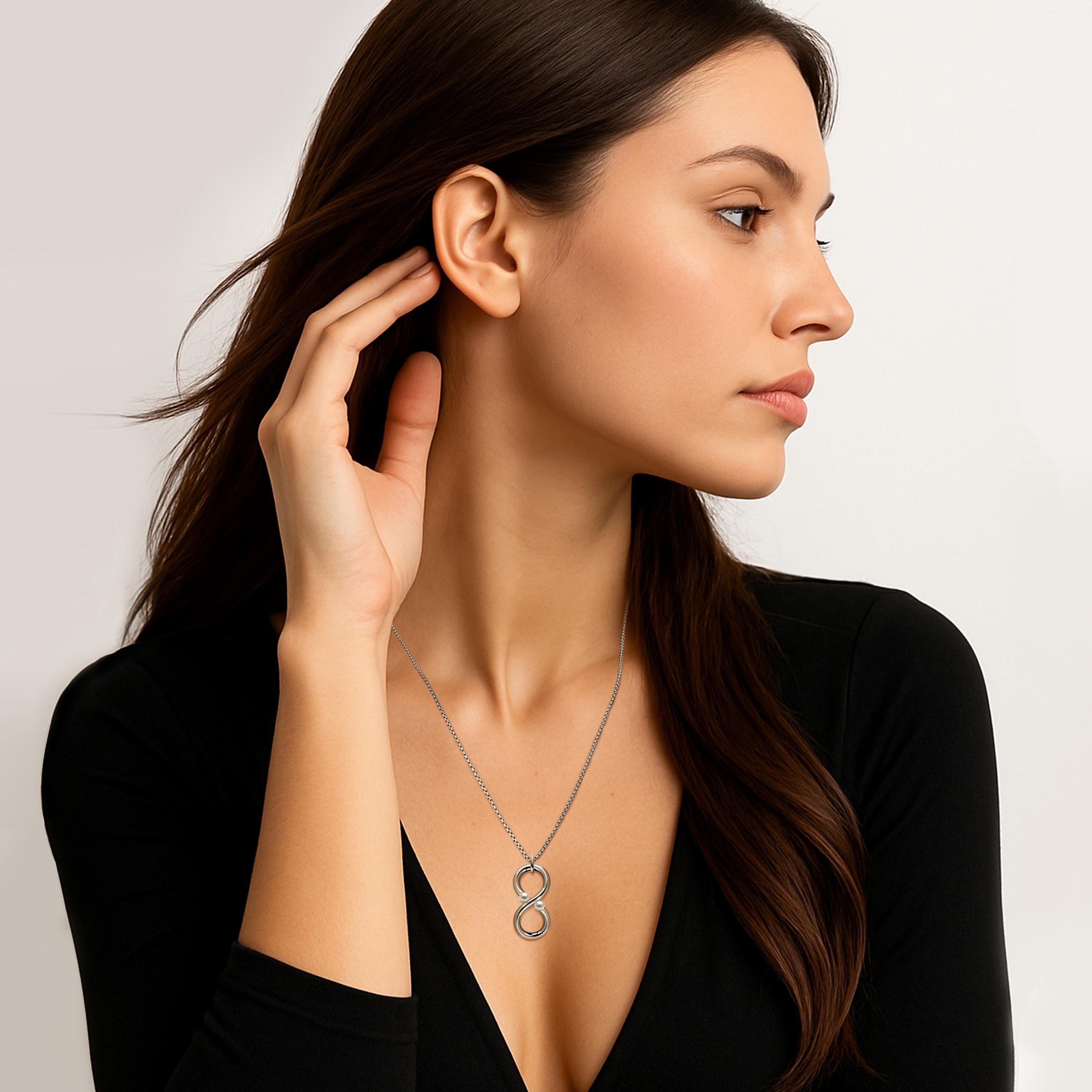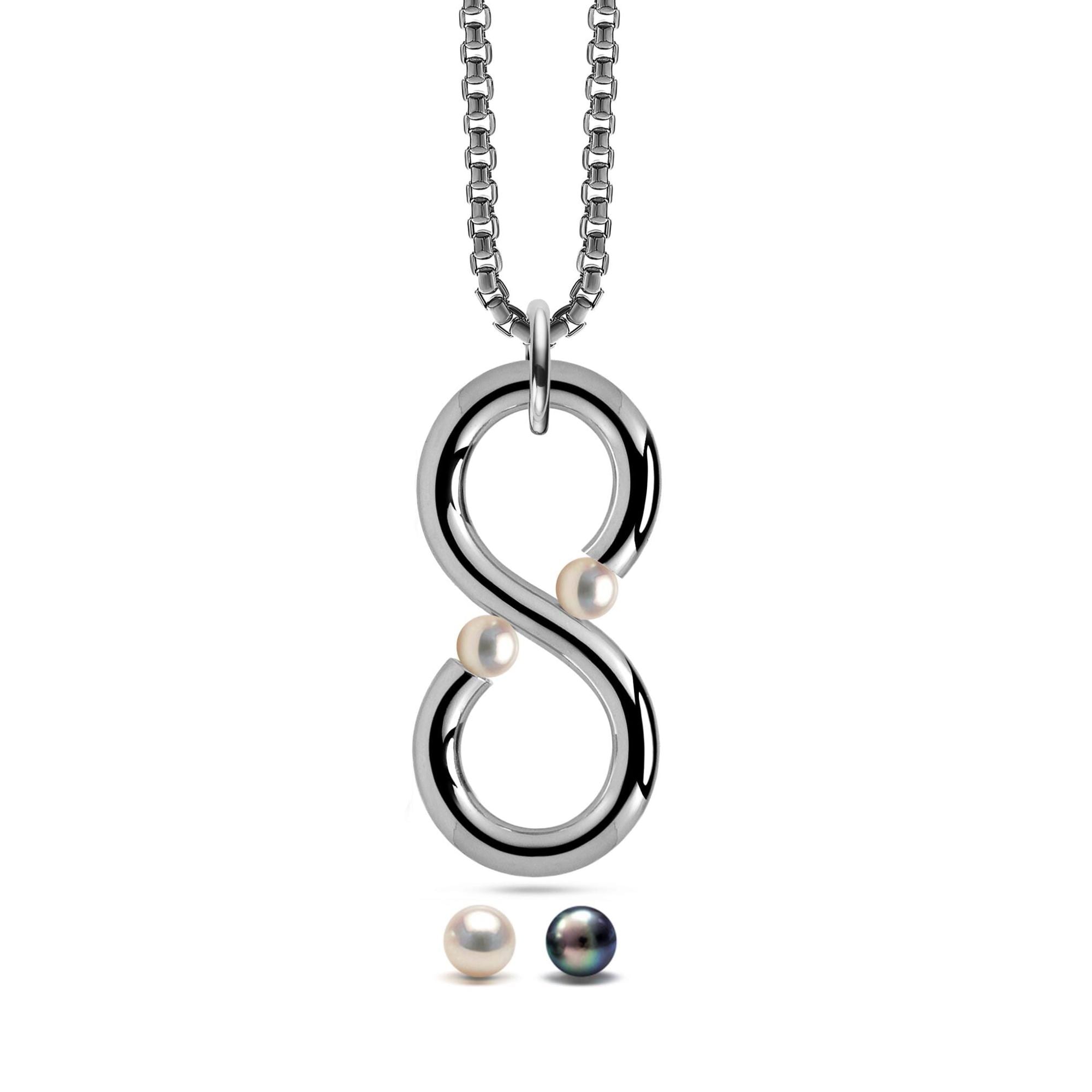 Elevate your everyday elegance with our enchanting INFINITY necklace, featuring two cultured pearls suspended within a sleek, vertical infinity symbol. Crafted from polished 316 stainless steel, the pendant gently cradles the pearls through precise tension setting, allowing light to illuminate their natural radiance—whether you choose all white pearls, all black pearls or a mix of white and black pearl.