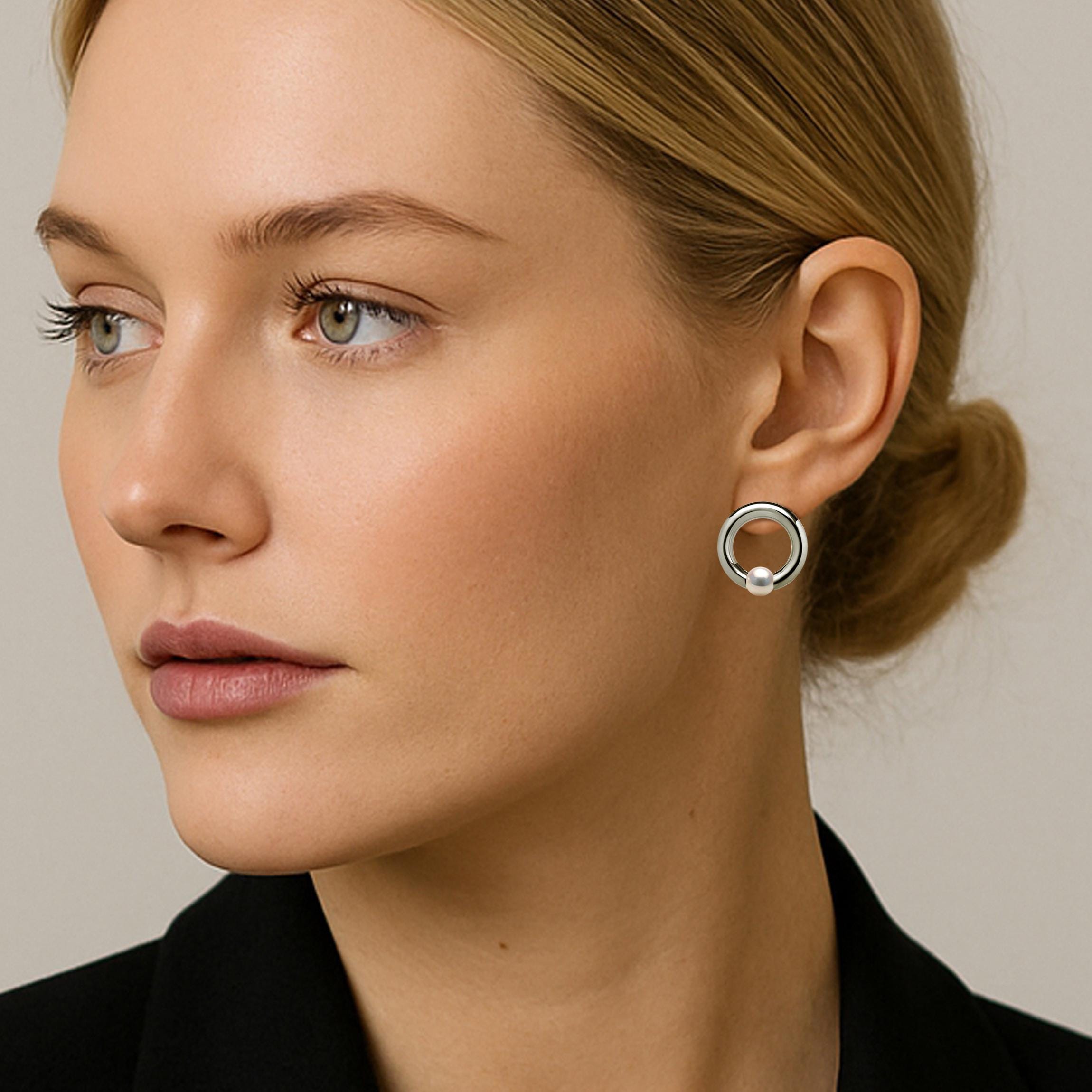 Effortlessly chic and minimalist, these LUNA studs feature a sleek tubular stainless steel circle that frames a radiant 6mm round natural white pearl. Meticulously tension-set at the base of the hoop, the gem appears to float—surrounded by light, accentuating its full brilliance. The LUNA studs offer a clean, sculptural silhouette that brings a subtle yet striking glow to any look. The pearl’s floating effect within the open hoop draws the eye with understated elegance—perfect for both daily wear and evening style.